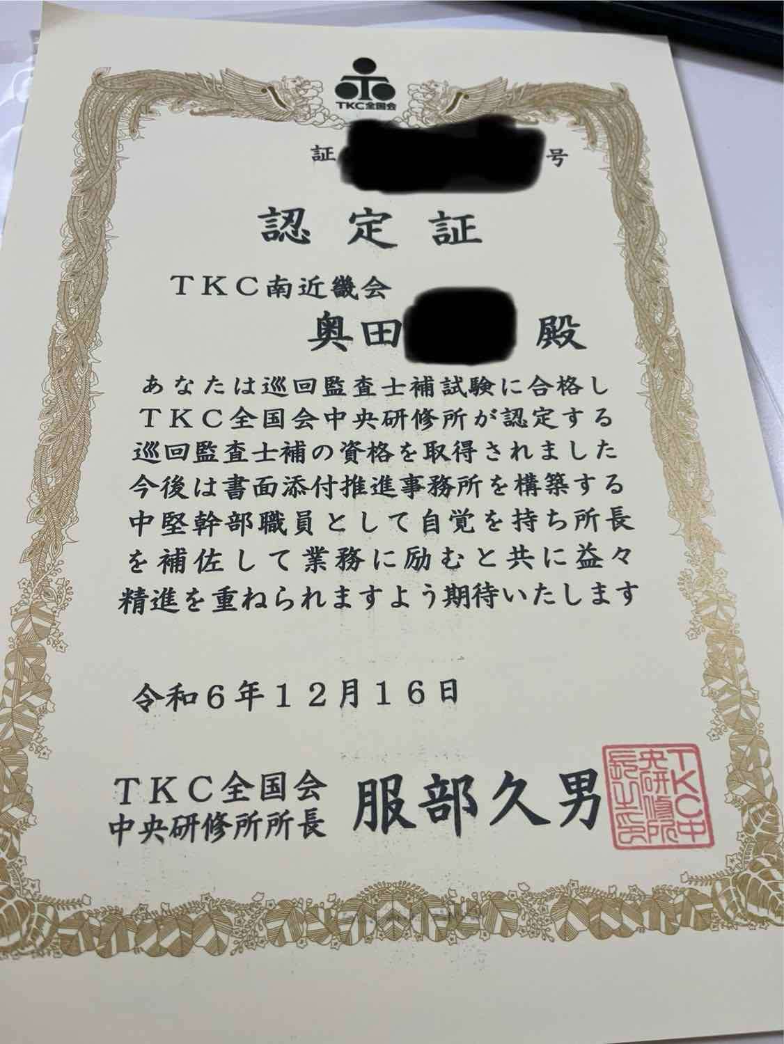 な、なんと、全科目合格して、巡回監査士補に認定されました!!